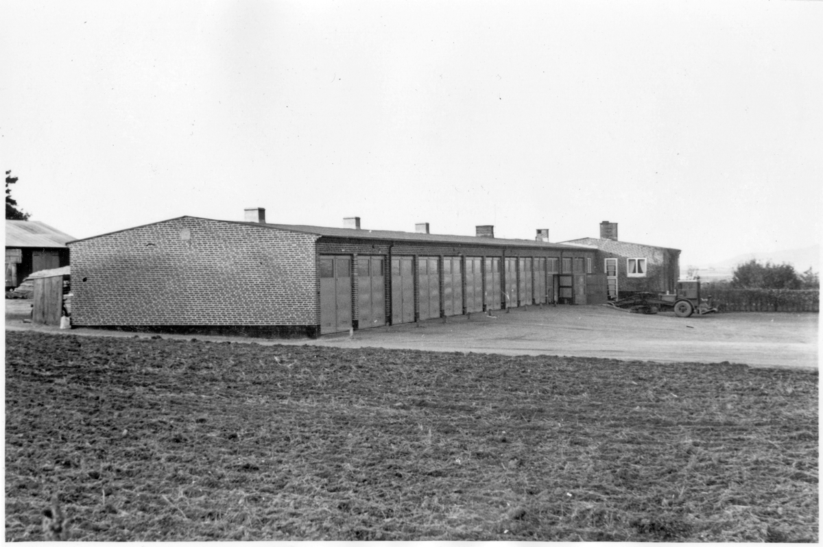 Vägstation N3, Kvibille. Garagebyggnad, i tegel, och längst bort kontorsbyggnad. Väghyvel framför byggnaden. Bakom garaget skymtar förrådsbyggnader.