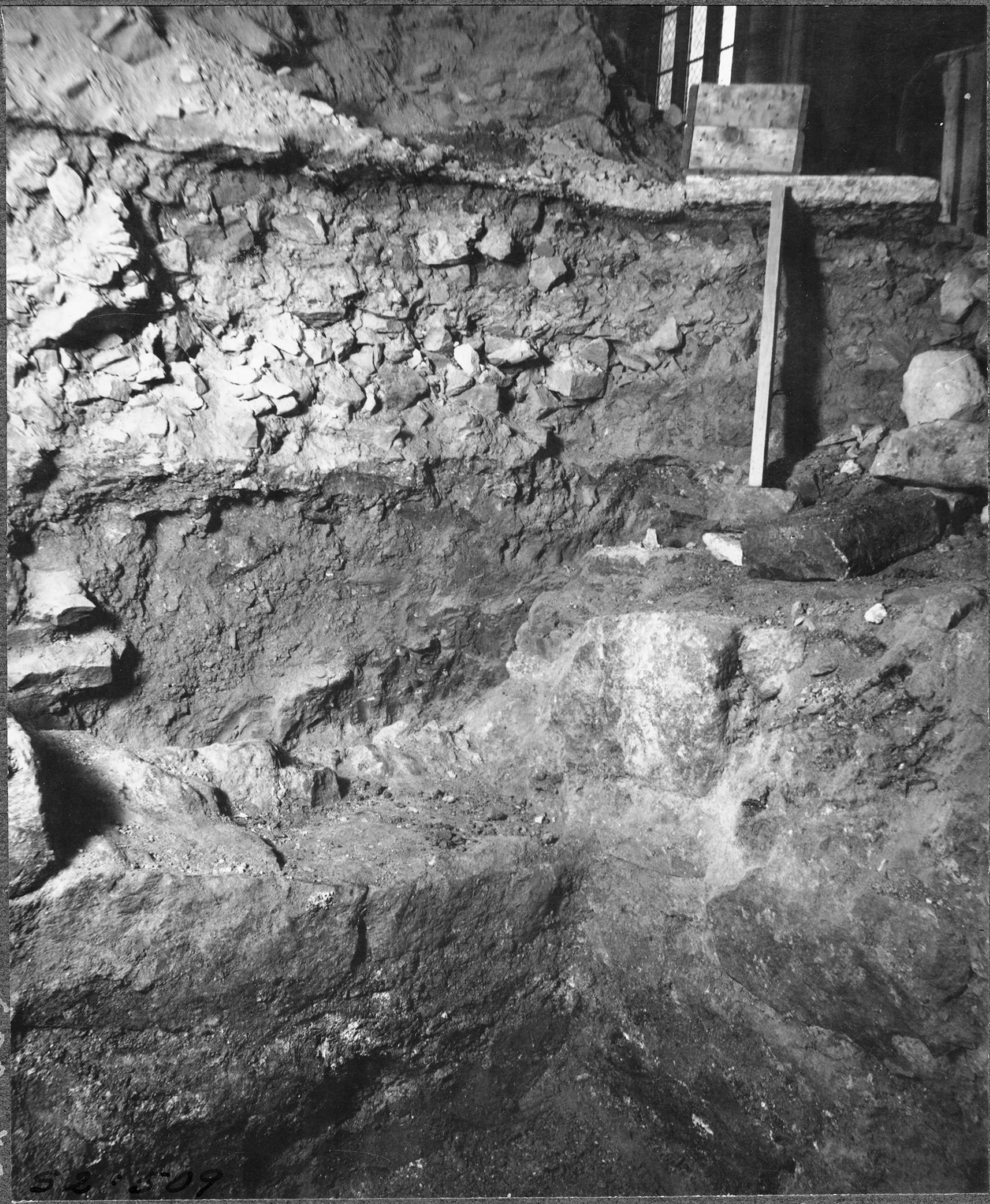 Grävning inom kyrkan, schakt X, "relikkammarens" nordvästra hörn från sydöst.
