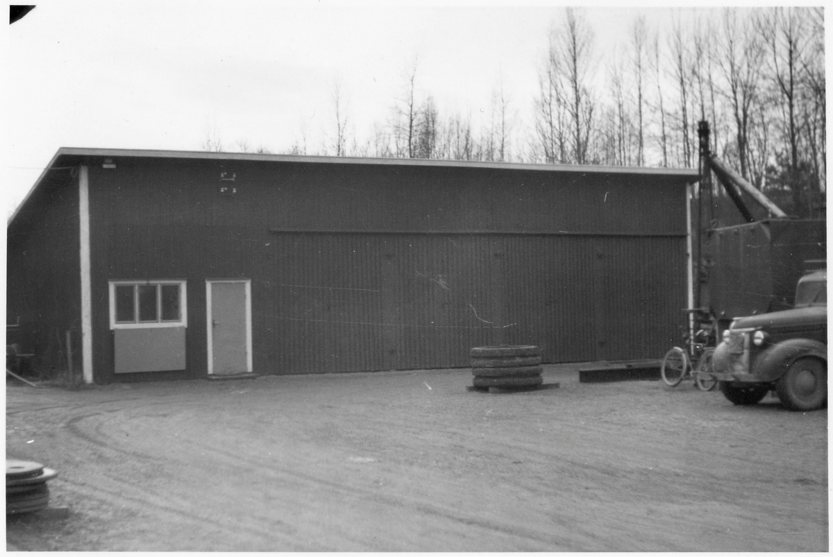 Depåförrådet i Ånstaberg (Vägstation T5). Förrådsbyggnad. Lastbil skymtar till höger, cykel.
