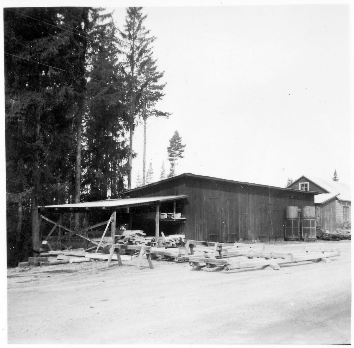 Vägstation Y1, Östavall. Förrådsbyggnad. Upplag av trävirke.