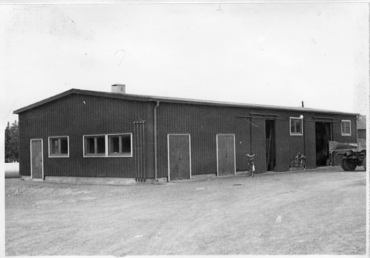 Vägstation R3, Tibro. Förrådsbyggnad. Bakdelen av lastbil till höger, cyklar.