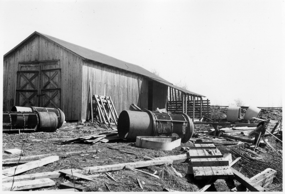 Vägstation Y9, Själevad. Förrådsbyggnad. Trummor till grussorteringsverk, diverse virke framför byggnaden, cementrör.