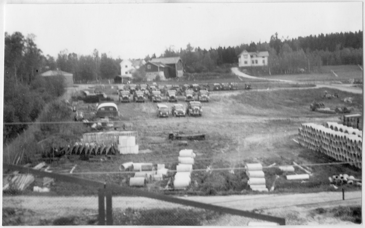 Vägstation Y6, Älandsbro. Uppställning av lastbilar och personbilar, förmodligen med koppling till depåverkstaden. Husvagn till vänster. I förgrunden upplag av cementrör. Bondgård och bostadshus i bakgrunden.