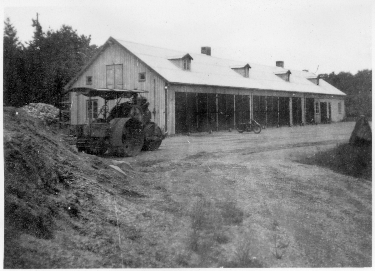 Vägstation O7, Tanumshede. Vägstationens huvudbyggnad med garage, förråd och kontor. På garageplan Munktell motorvält och motorcykel.