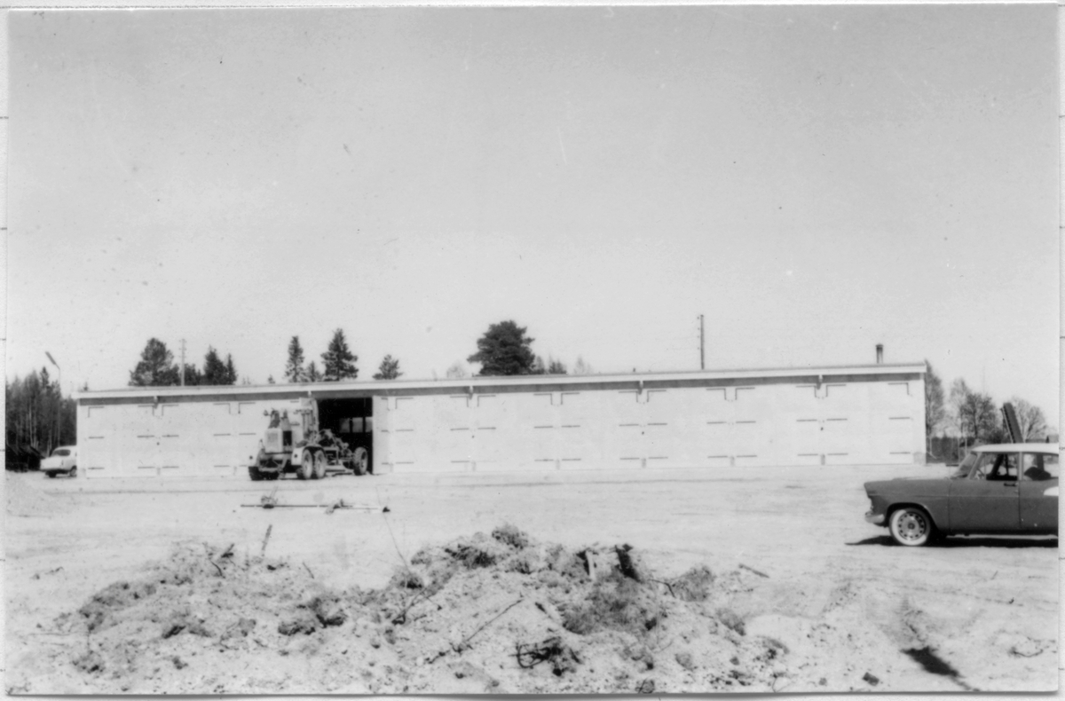 Vägstation AC7, Lövånger. Garagebyggnad. Väghyvel framför öppen garageport. Personbilar. Viss markberedning av garageplan pågår.
