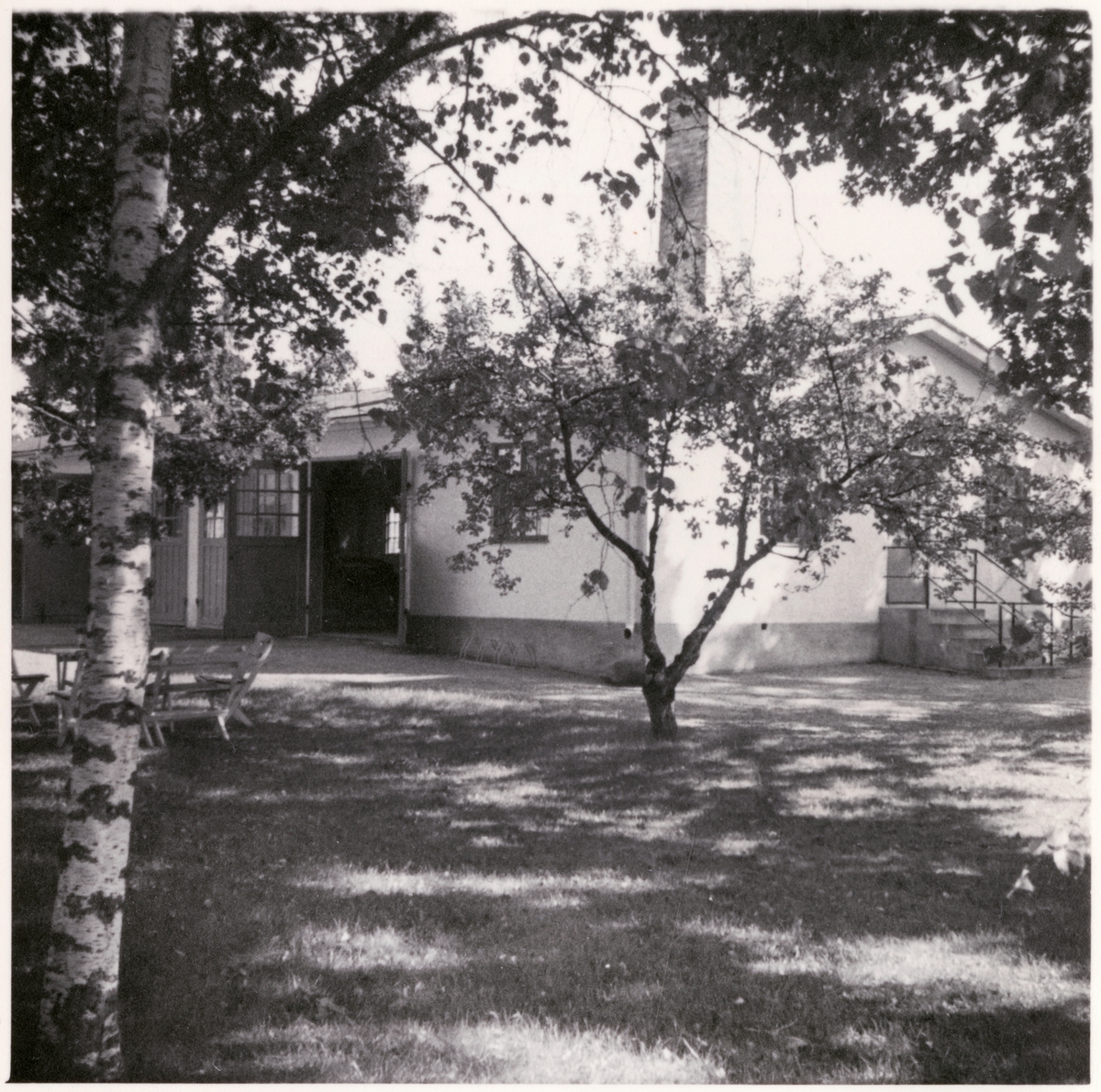 Vägstation G7, Ingelstad. Vägstationens byggnad med del av garagedelen och kontorsdelen, trädgård med träd och trädgårdsmöbel.