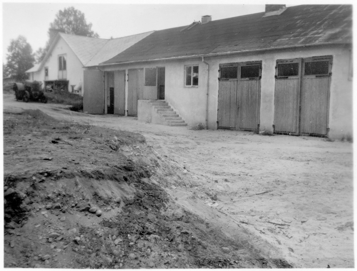 Vägstation P4, Tranemo. Vägstationens huvudbyggnad med förråd och kontor (framsidan). Garageplan håller på att schaktas. Traktor i bakgrunden.