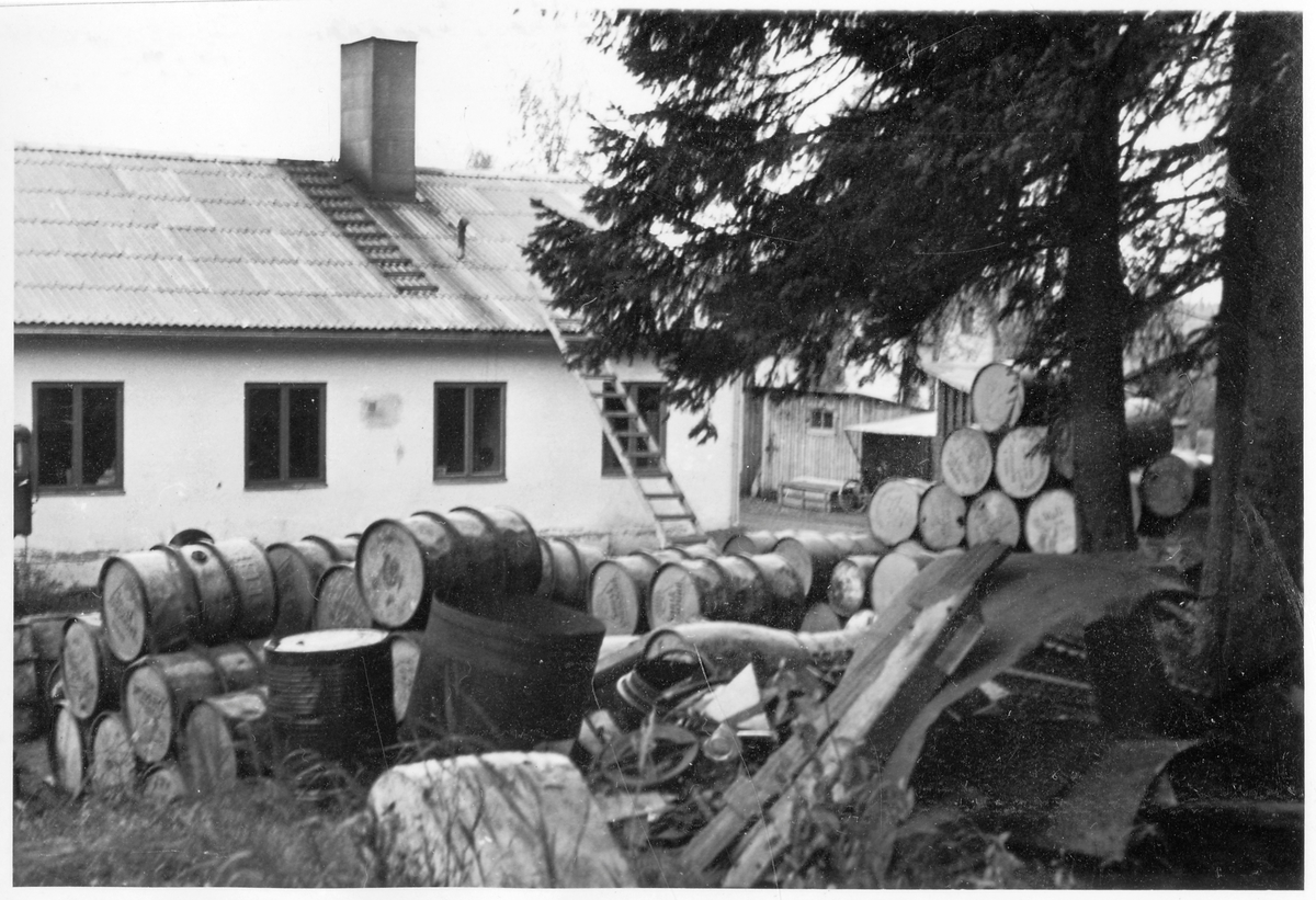 Vägstation Z13, Gäddede. Baksidan av vägstationens huvudbyggnad. Upplag av bränslefat och diverse "skrot".