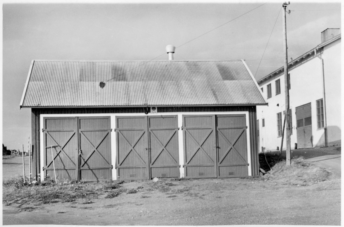 Vägstation Z3, Brunflo, filial Valla. Garagebyggnad. Ovanför garageportarna skylt med Vov emblem och texten "Z g 4". Vägstationens huvudbyggnad till höger.