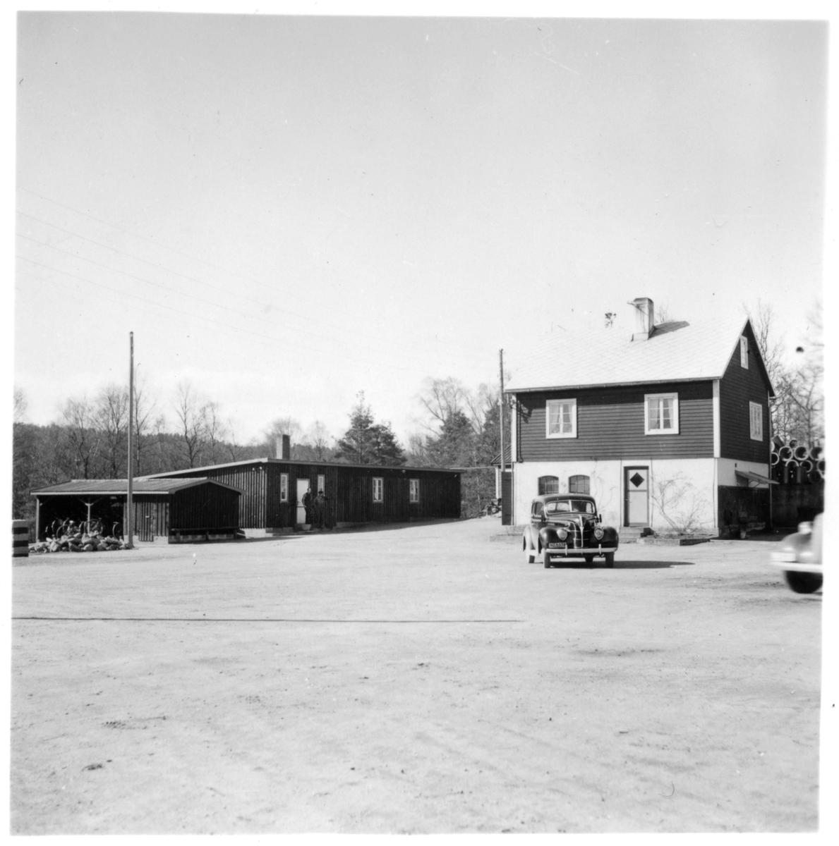 Vägstation L3, Örkelljunga. Bostadshus, eventuellt tjänstebostad för vägmästaren, byggnad till vänster kontors- eller rastlokal för vägarbetarna, två manspersoner vid dörren. Öppet skjul med cykelställ med cyklar. Personbil på garageplan.