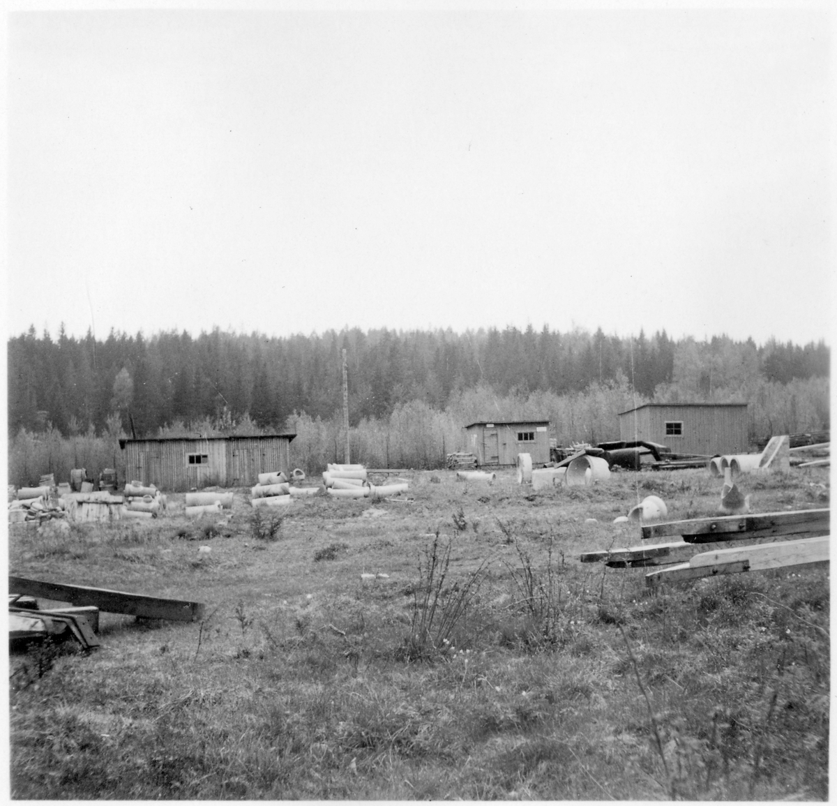 Y län. Före detta hamnförrådet. Förrådsbyggnader. Upplag av diverse material runt byggnaderna, bland annat cementrör.