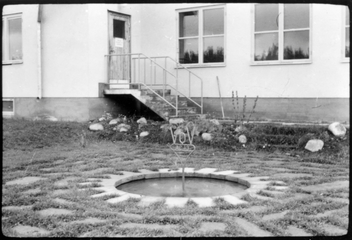Vägstation AC13, Malåträsk. Vägstationens huvudbyggnad (baksidan). Ingång till kontorsdelen. Framför trappan liten trädgårdsbrunn med en skylt i smidesjärn "VoV AC 13".