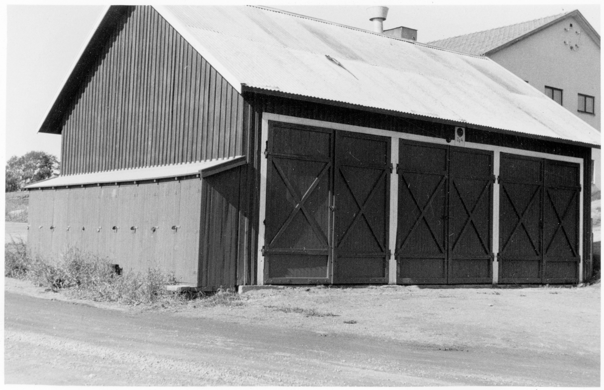 Vägstation Z3, Brunflo, filial Valla. Garagebyggnad. Ovanför garageportarna skylt med Vov emblem och texten "Z g 4". Vägstationens huvudbyggnad till höger. På gaveln manskapsskåp för manskapets personliga utrustning och redskap.