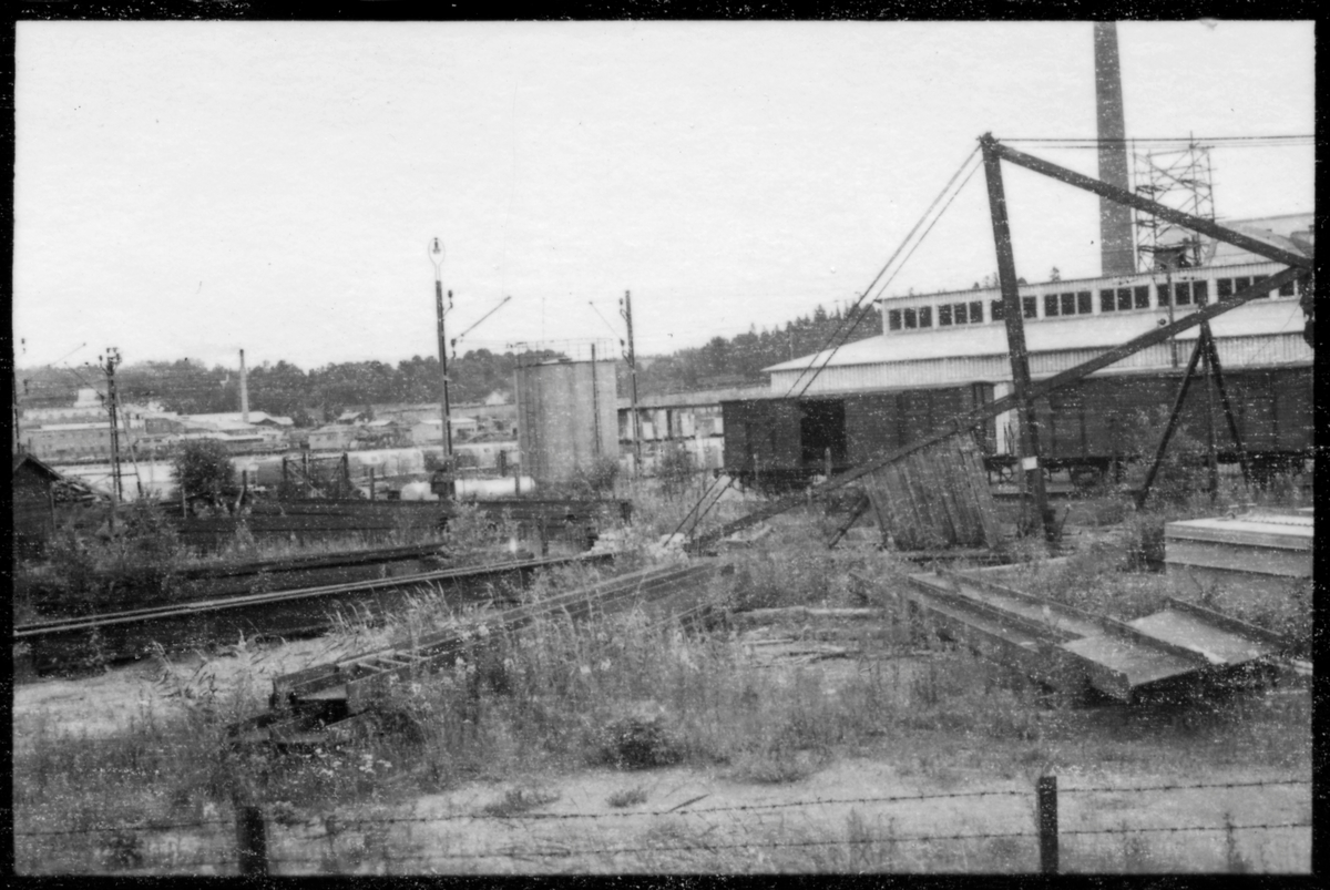 Vägstation B12, Järna. Balkupplaget, Södertälje. Järn- och betongbalkar. Järnvägsvagnar, gods, i bakgrunden.