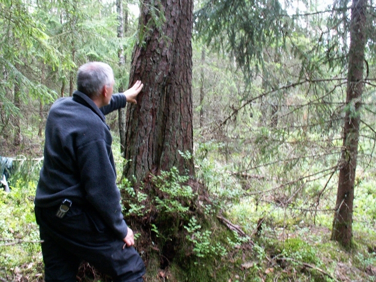 Foto av tjärtall. Spår av sk tjäruväckeri, där levande tallar skattades på tjärved. Analys från dendrokronologiska laboratoriet i Lund visar att tallens groddår är 1780. Den senaste säkra tjärvedsskattningen bedöms vara ca 1824. Bredvid tallen står Per Holmgren.