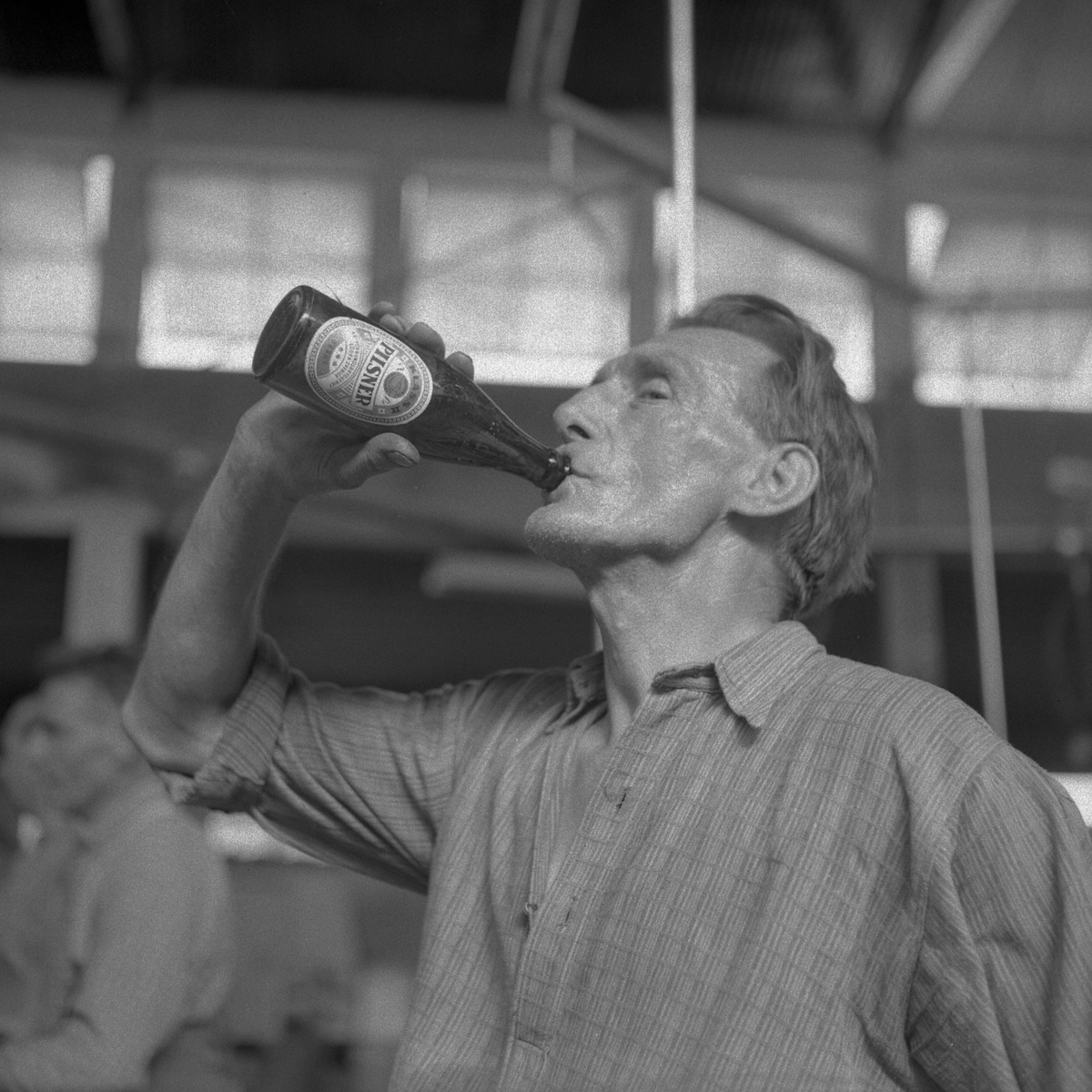 Foto av en man ur "degelgänget" som dricker en kall öl som belöning efter degelbytet. Se JEAK05062-JEAK05067