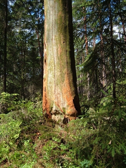 Foto av tjärtall. Spår efter sk tjäruväckeri, där levande tallar skattades på tjärved. Tydliga huggspår. Tallen är död.