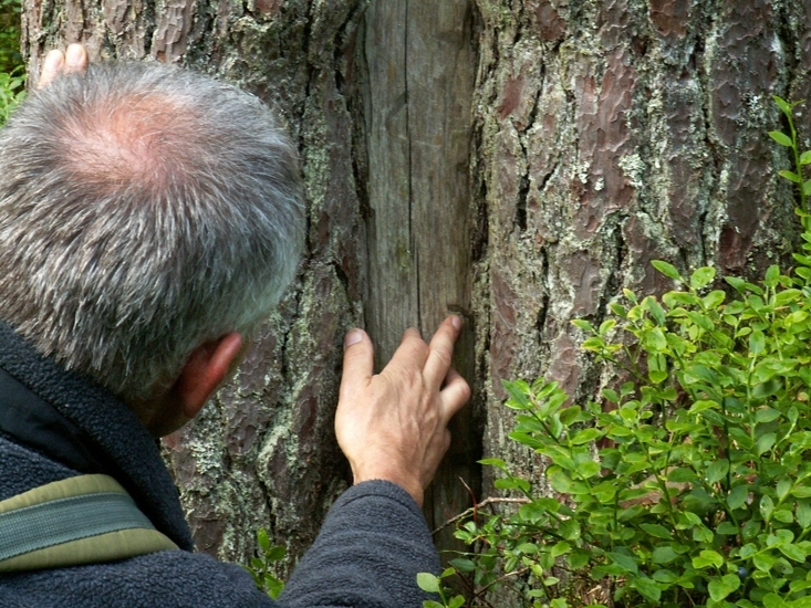 Foto av tjärtall, närbild. Spår av sk tjäruväckeri, där levande tallar skattades på tjärved. Analys från dendrokronologiska laboratoriet i Lund visar att tallens groddår är 1720. Den senaste säkra tjärvedsskattningen bedöms vara ca 1829. Per Holmgren pekar på ett tydligt spår av yxhugg.