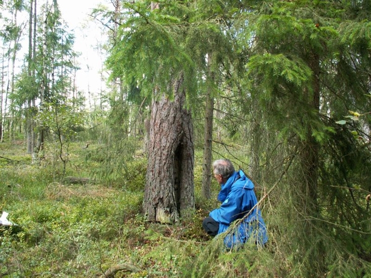 Foto av tjärtall. Spår efter sk tjäruväckeri, där levande tallar skattades på tjärved. Tydliga huggmärken. Ytan i skadan är delvis förkolnad. Vid roten i söder är ett fällskär (påbörjad fällning för länge sedan). Vid tallen sitter Per Holmgren.