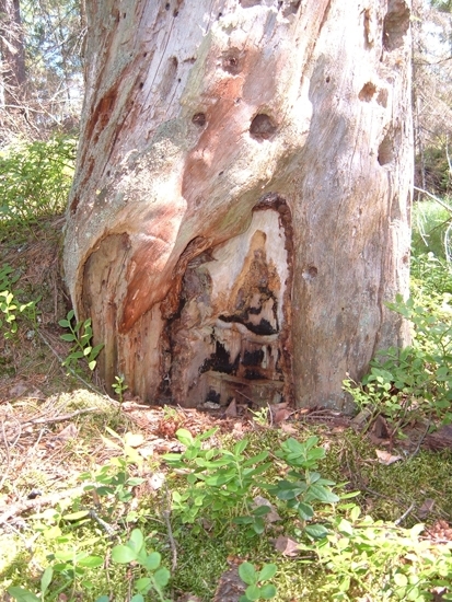 Foto av tjärtall, närbild. Spår efter sk tjäruväckeri, där levande tallar skattades på tjärved. Tydliga huggspår.Tallen är död sedan länge.