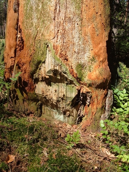 Foto av Tjärtall, närbild. Spår efter sk tjäruväckeri, där levande tallar skattades på tjärved. Tydliga huggspår. Tallen är död.