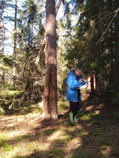 Foto av tjärtall. Spår efter sk tjäruväckeri, där levande tallar skattades på tjärved. På sydöstra sidan är en urhuggning.Tydliga huggspår.