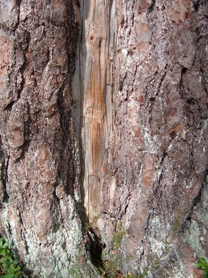 Foto av tjärtall, närbild. Spår efter sk tjäruväckeri, där levande tallar skattades på tjärved.