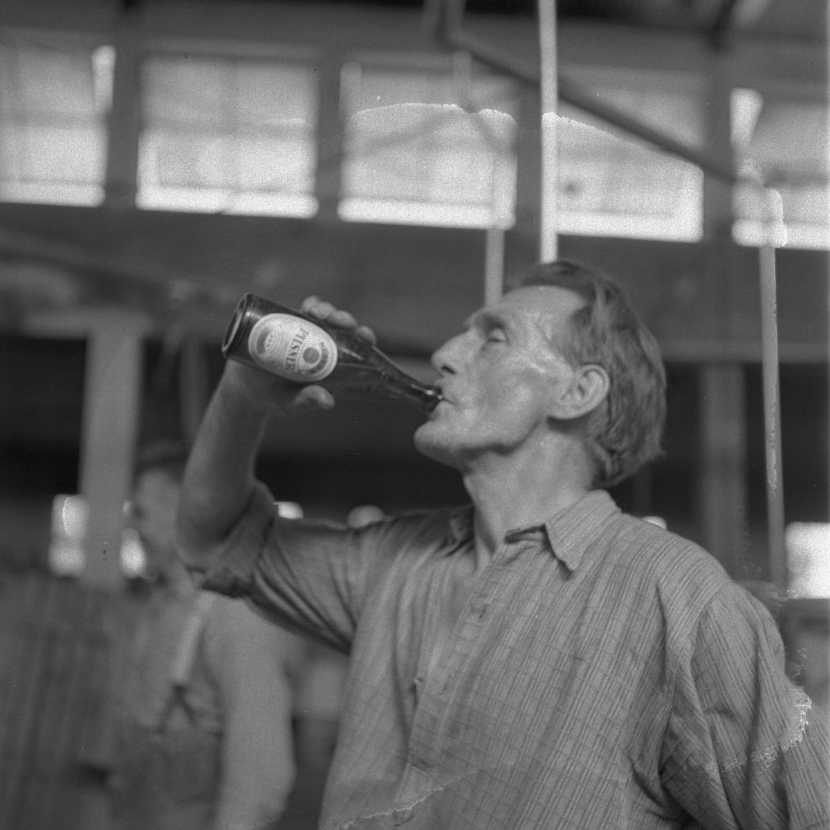 Foto av en man ur "degelgänget" som dricker en kall öl som belöning efter degelbytet. Se JEAK05062-JEAK05067