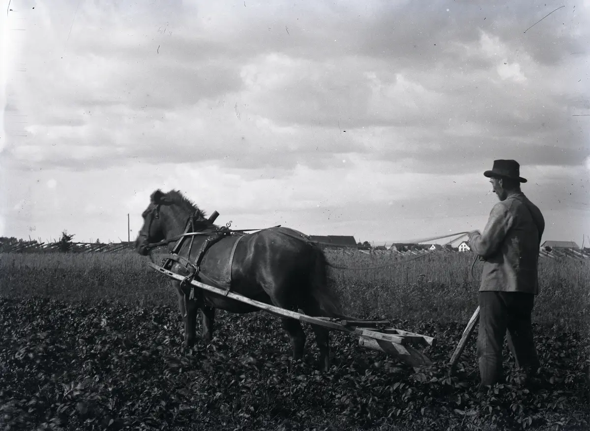 Att ympa potatisen betyder att man kupar upp jorden mot stånden, så att knölarna inte skall komma fram i solljuset och bli gröna. Här går Fäi-Jakå med hästen hemma i pärstycket, potatisåkern, vid Fie.