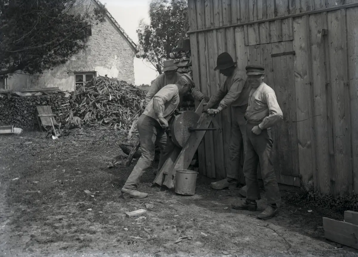 Hallsarve Hans Karlsson vässer yxen på vässtenen, vars stativ är lutad mot en vedbodvägg för bättre arbetshöjd. Troligen är det svärfar Tomas Nilsson som står bakom och håller i stativet. Någon av sönerna Vilhelm eller Oskar drar veven, medan yngste sonen Arvid, 14 år, ser på fotografen. I bakgrunden ses vedbacken med floved och en hög upphuggen grenved.