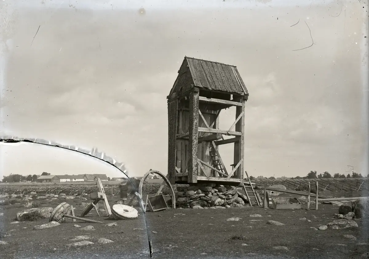 Det ser ut som om Jakob har börjat riva ur kvarnen inför en reparation redan här ett år i förväg. Makineriet med stenarna ligger ute, axeln är urtagen, liksom persen, bromsen, tratten mm.