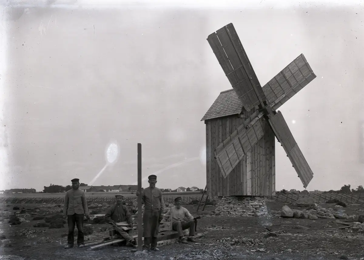 Kvarnen är färdigrestaurerad, brädklädnaden är på, liksom spåntaket och vingarna med alla luckorna isatta. En stolt bild av en väderkvarn! Datumet måste vara fel! Se ovan!