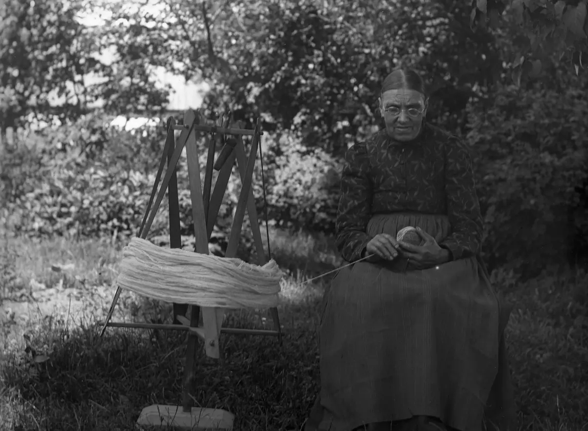 Gannor Anna Larsdotter, 68 år, sitter och nystar upp garn från härvan på nysteln.