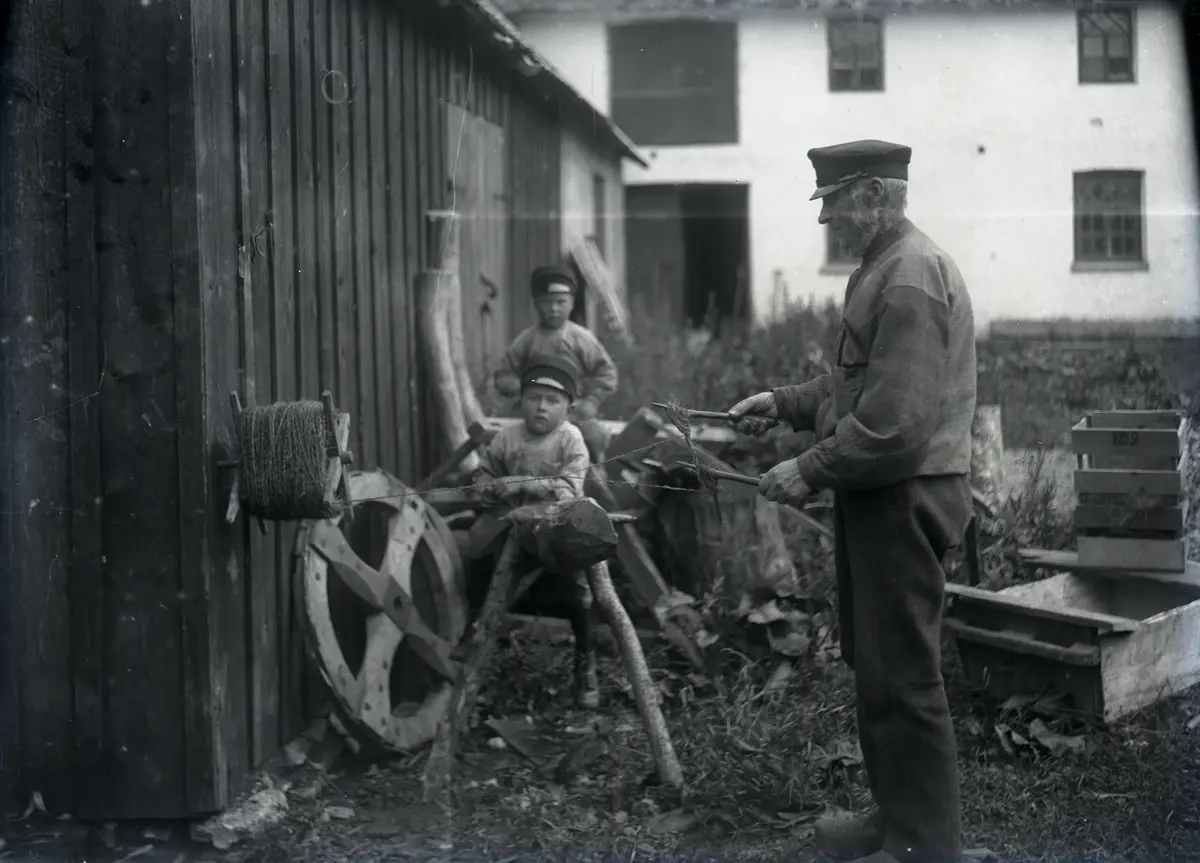 Smiss Christen Christensson på Smiss södra part slår ihop två tåtar vid vedbodsväggen, barnbarnen Vilhelm och Verner ser på.