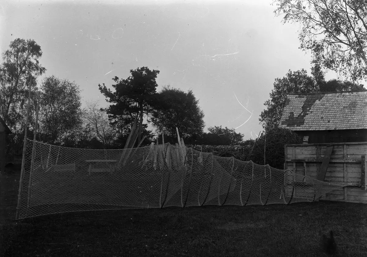 Masse visar en stor ryssja med två kammare uppspänd mellan två armstakar och en vagnsbotten hemma på gården hos Vilhelm Pettersson Hallute på När.
