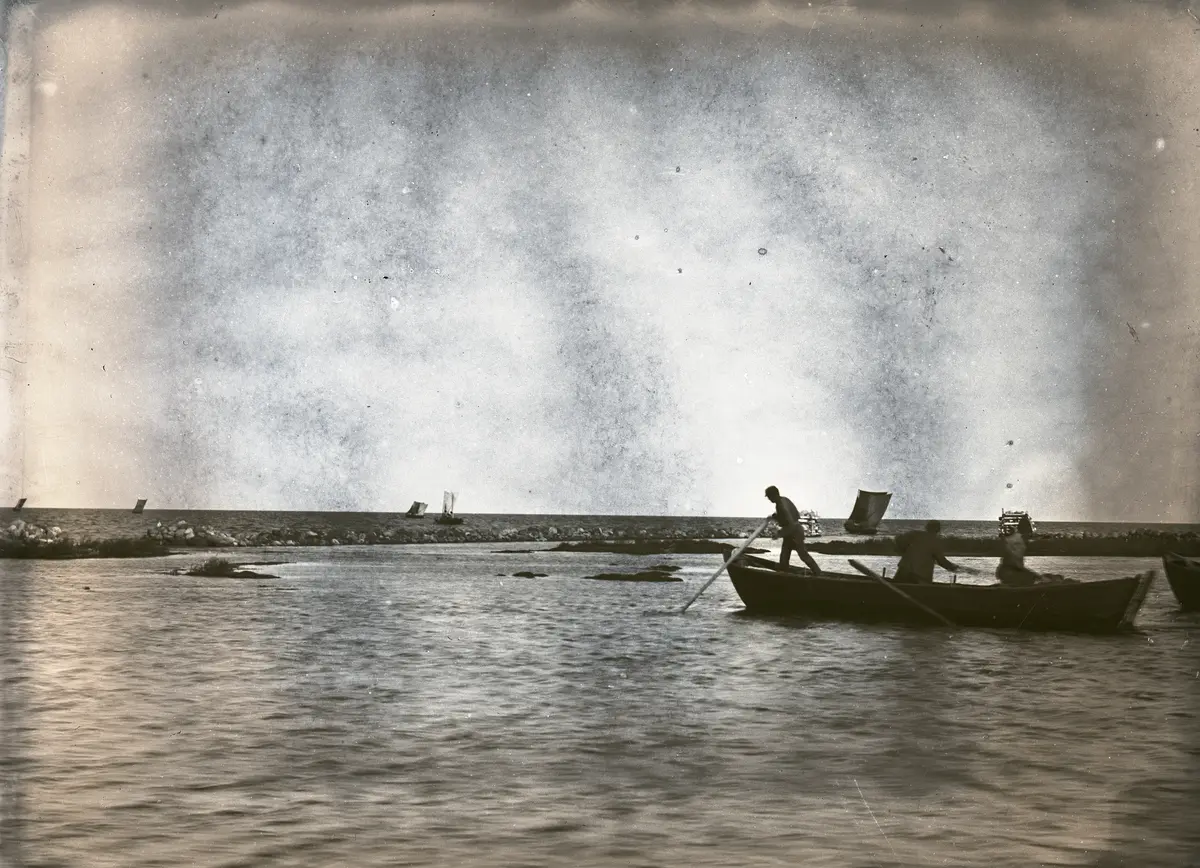 Här ger man sig iväg, stakar och ror ut från stranden. Flera fiskelag har redan kommit ut och satt sina segel, för att segla ut till fiskeplatserna, som ofta låg miltals ut i sjön. Det blåser lite, man ser hur båtarna med segel lutar. Se Nr 412.