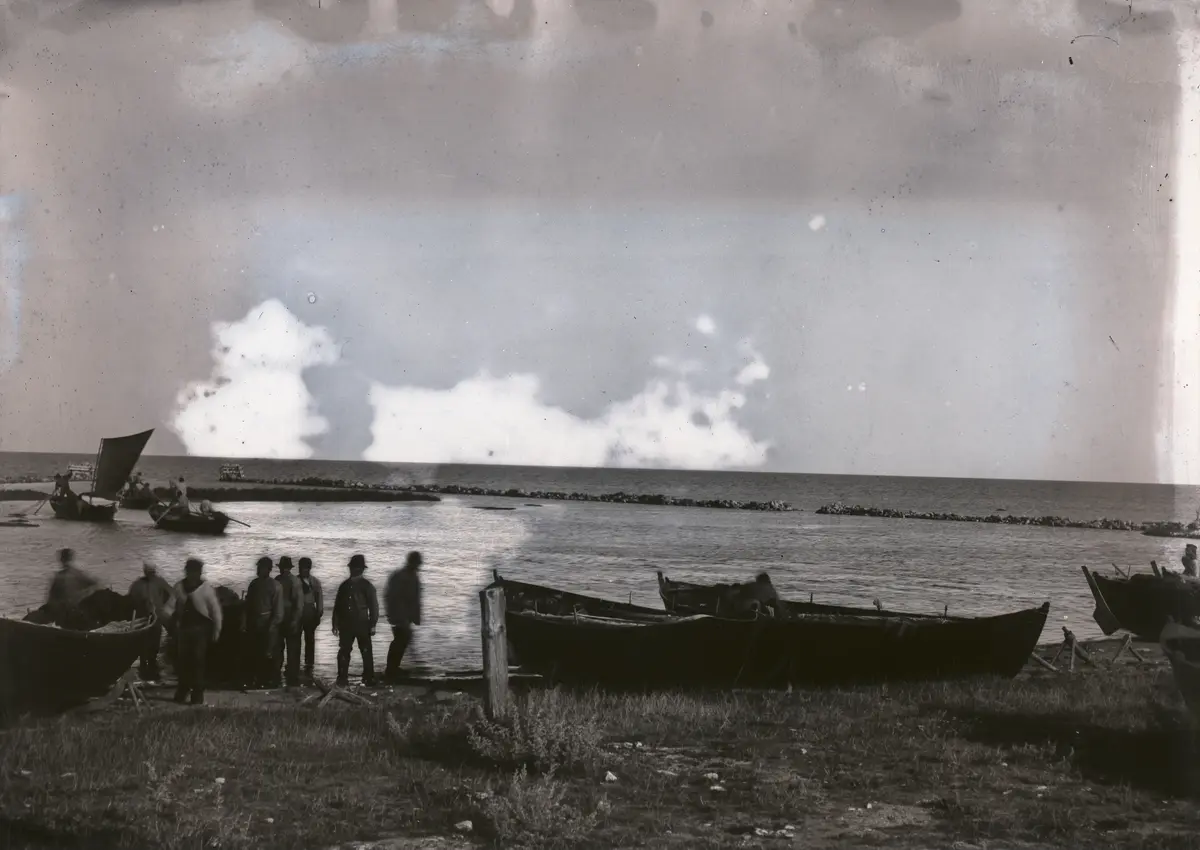 Det är dags att ge sig iväg ut för nattens fiske. Några båtar har redan kommit ut, andra lastar ännu i fiskedonen. Alla verkar fiska samtidigt, vilket var rätt brukligt. Man fiskade jämt när vädret var gott och det inte var något akut med skörd e dyl. Fisk var basmat som åts till de flesta av dagens måltider, särskilt strömming. Man saltade in tunnvis med fisk för årets behov. Man visste aldrig när man kunde komma ut nästa gång för vädret, så det gällde att passa på. Dessutom var man flera i ett båtlag och då måste man hjälpas åt, det gick inte an att någon hade annat för sig. I regel hade man också strikta roller i båten som man inte bytte, var och en måste utföra sin uppgift. Se Nr 409.