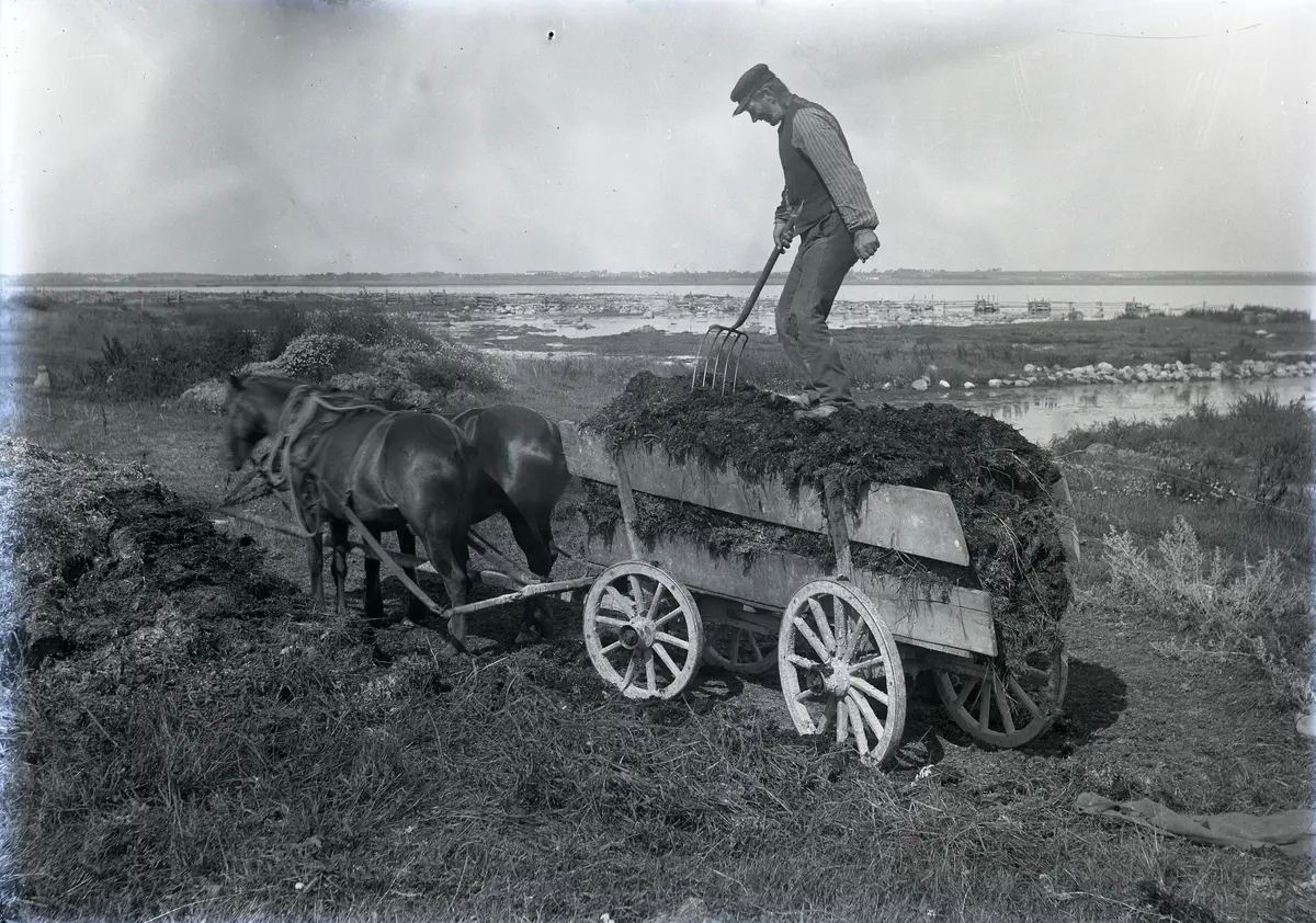 Fäi-Jakå trampar till lasset så släken packar sig, så inget ramlar av och att han får på så mycket som möjligt. På marken bakom lasset ligger en säck. Troligen tänker Jakå sitta på den på lasset och åka, men det kan han nog bara göra på slät mark och i nedförsbacke. Vägen hem är mest uppförsbacke, så han fick sannolikt mestadels gå bredvid.