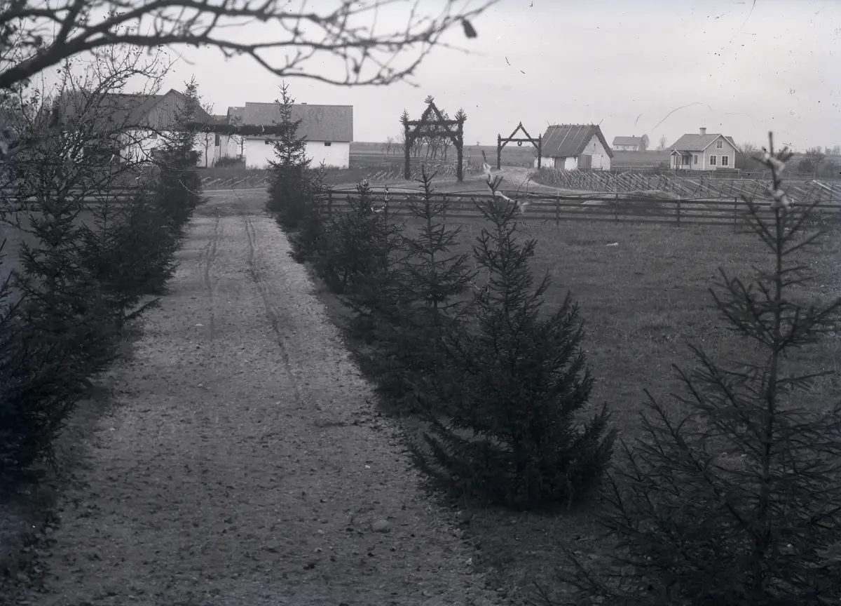 Masse har här fotograferat den hedersbevisning brudparet och brudens hem erfor i form av äreport och allé. På Kauparve Larssons part skulle bröllopet hållas i slutet av oktober och därför har man valt granar till allé från gatgrinden till manbyggnadens trappa. Ute vid grinden står en äreport. Mitt i vägkorsningen, det s k Kotorget, står huvudäreporten och längre bort mot kyrkan ytterligare en äreport, alla troligen uppsatta av både släkt och vänner. Det här var mer än brukligt, varför brudparet måste ha varit mycket uppskattade.