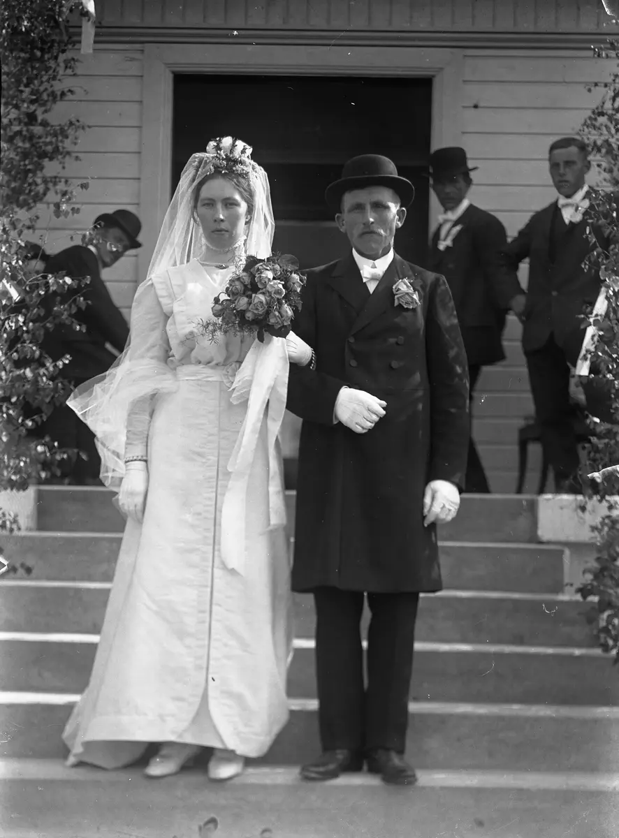 Masse har nog blivit ombedd att ta bröllopsfoto iom att det finns tre bilder av brudparet här ifrån trappan. Festföremålen ser lite spända ut, särskilt Anton verkar lite tafatt med sina vita handskar på det tredje fotot.