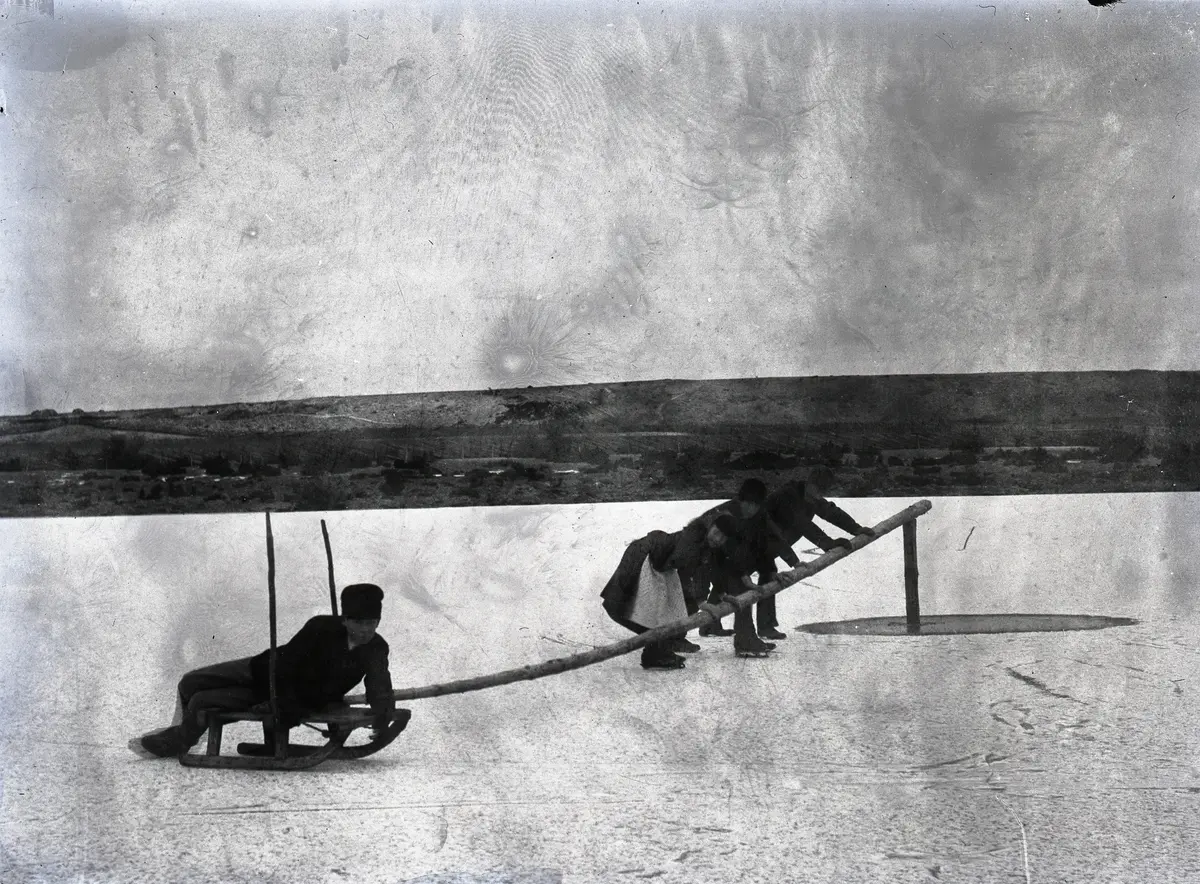 Barnen har ordnat issnurra på Smiss vät norr om gården en barvinterdag i "Helgmillum" mellan jul och nyår. Det har tydligen varit en kallperiod eftersom Smiss vät frusit, men i beteshagen och på backarna i bakgrunden syns nästan ingen snö. Man har slagit ner en påle genom isen ner i vätens botten och fäst en tapp i pålen. Sedan har man hakat en lång stång i pålen, vilken är fäst i en kälke. Barnen skjuter stången framför sig, vilket medför stor fart på kälken längst ut i cirkelns periferi.