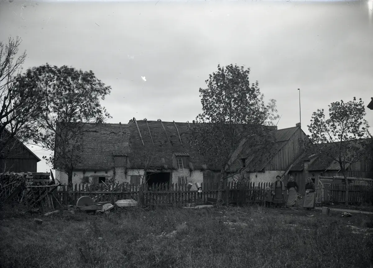 Längst t h skymtar takkanten på manbyggnaden. Om man ser i gräset nedanför och fram mot kvinnorna, ser man grundstenar i marken. Det betyder att man rivit brygghuset som stod mycket trångt inpå manbyggnaden, se Bild 555. När grannparten revs 1907, fick Melanders dess gårdstomt och behöll då dess brygghus, vilket var större och modernare än det gamla.