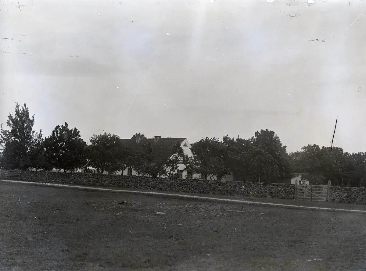 Bilden är tagen från beteshagen i norr. Hagen har inga buskar jämfört med idag. Annars är det i stort sett sig likt. Infartsvägen är likadan och stenmuren, men grinden in till den 1870 rivna och flyttade grannparten är borta. Bergmans manbyggnad skymtar bakom träden, t h ser man också smedjans gavel. Där emellan kan man ana flygeln.