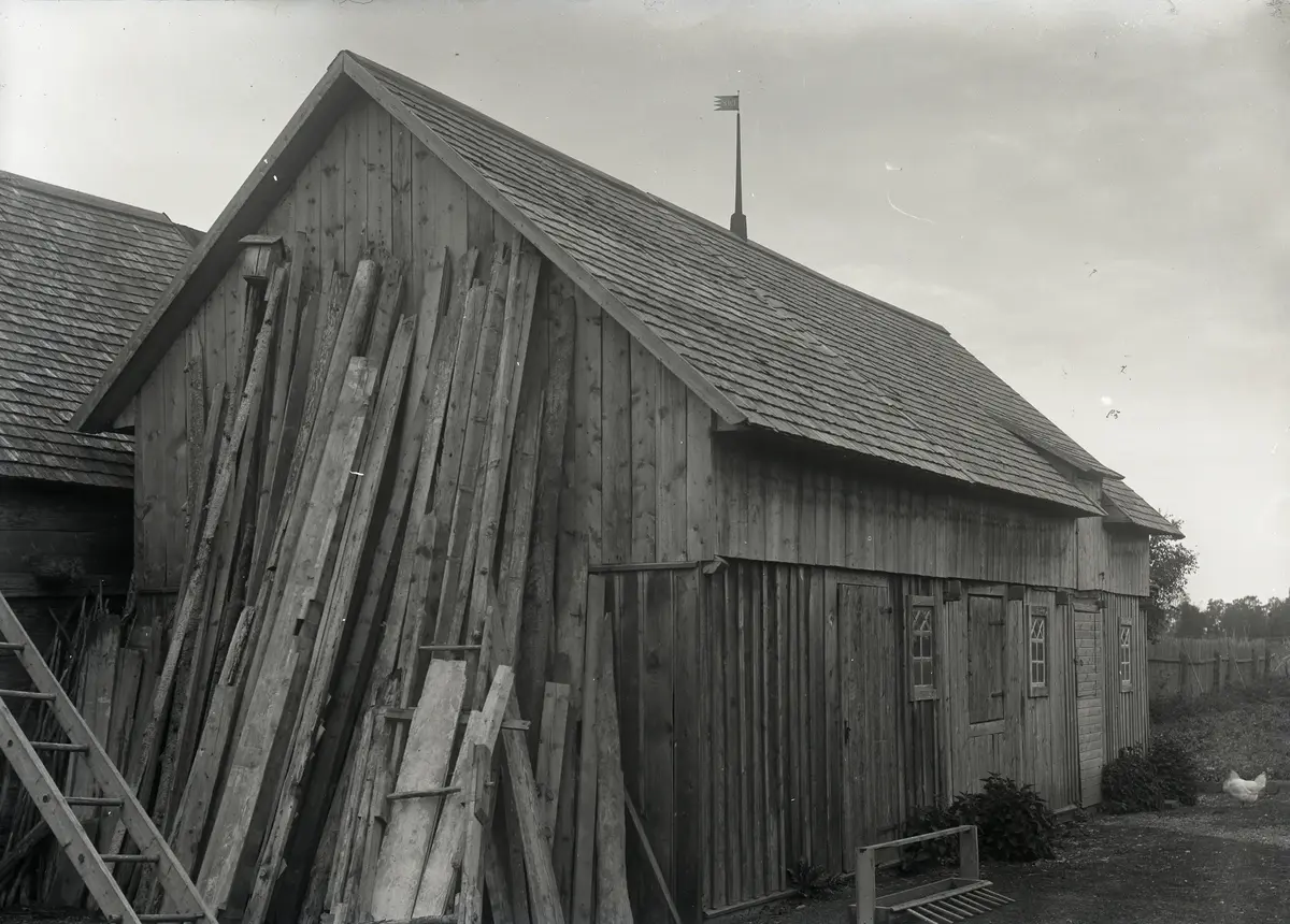 Det var inte bara bakbygget till manbyggnaden som köptes in och flyttades hit, se Bild 605, utan även uthuset är ett hitflyttat bulhus. Det har panelats in och byggts på med ett foderloft täckt med ett spåntak. Skarven i spåntaket och den lite olika mörkheten på panelen kan tyda på att uthuset är uppfört i två etapper. Vad det innehållit är oklart, men foderluckan i väggen tyder på att det var fähus innanför. Man kan ha haft 1-2 kor, någon gris och lite höns. Grannens bulladugård står precis rygg i rygg! Än idag!