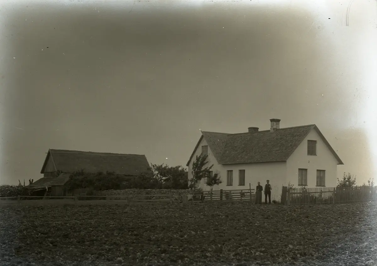 Här står Olina född Östman 1857 och Alfred Öberg född 1864 framför det ställe som Olina ärvt. Öbergs hade troligen uppfört husets bakbygge rätt nyligen, det gamla husets tak hade när bilden togs 1912 ännu inte anpassats till samma utstick över gaveln som det nya. Gårdsmuren har inte förlängts, utan slutar i linje med gamla husets bakre hörn. Öbergs byggde också den nya ladugården, men den senare tillagda vinkeln på ladugården har inte påbörjats, här står ännu några småbodar. Se Bild 597!