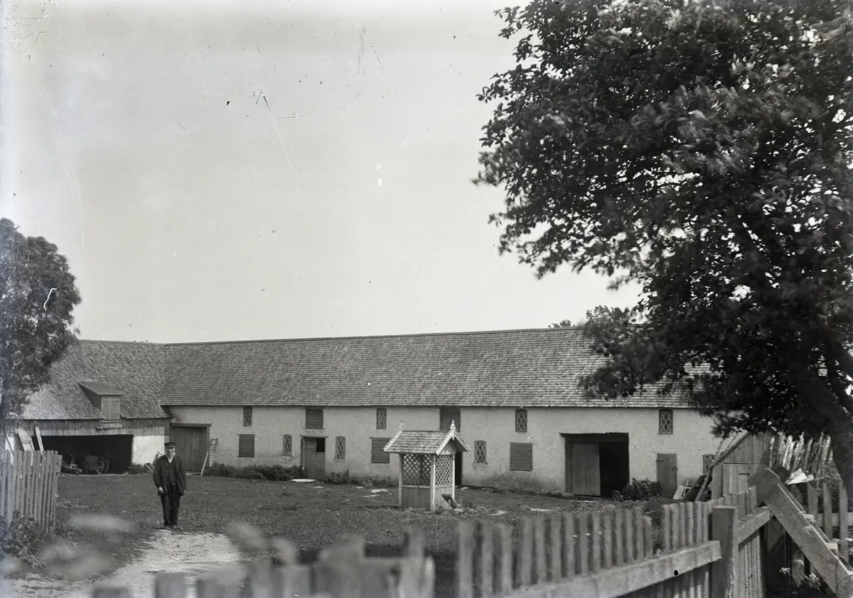 Den säregna snickarglädjebyggnaden på gårdsplanen kan vara ett brunnshus. Mannen på bilden kan möjligen vara Josefina Johanssons styvfar Oskar Jakobsson från Bjärges.