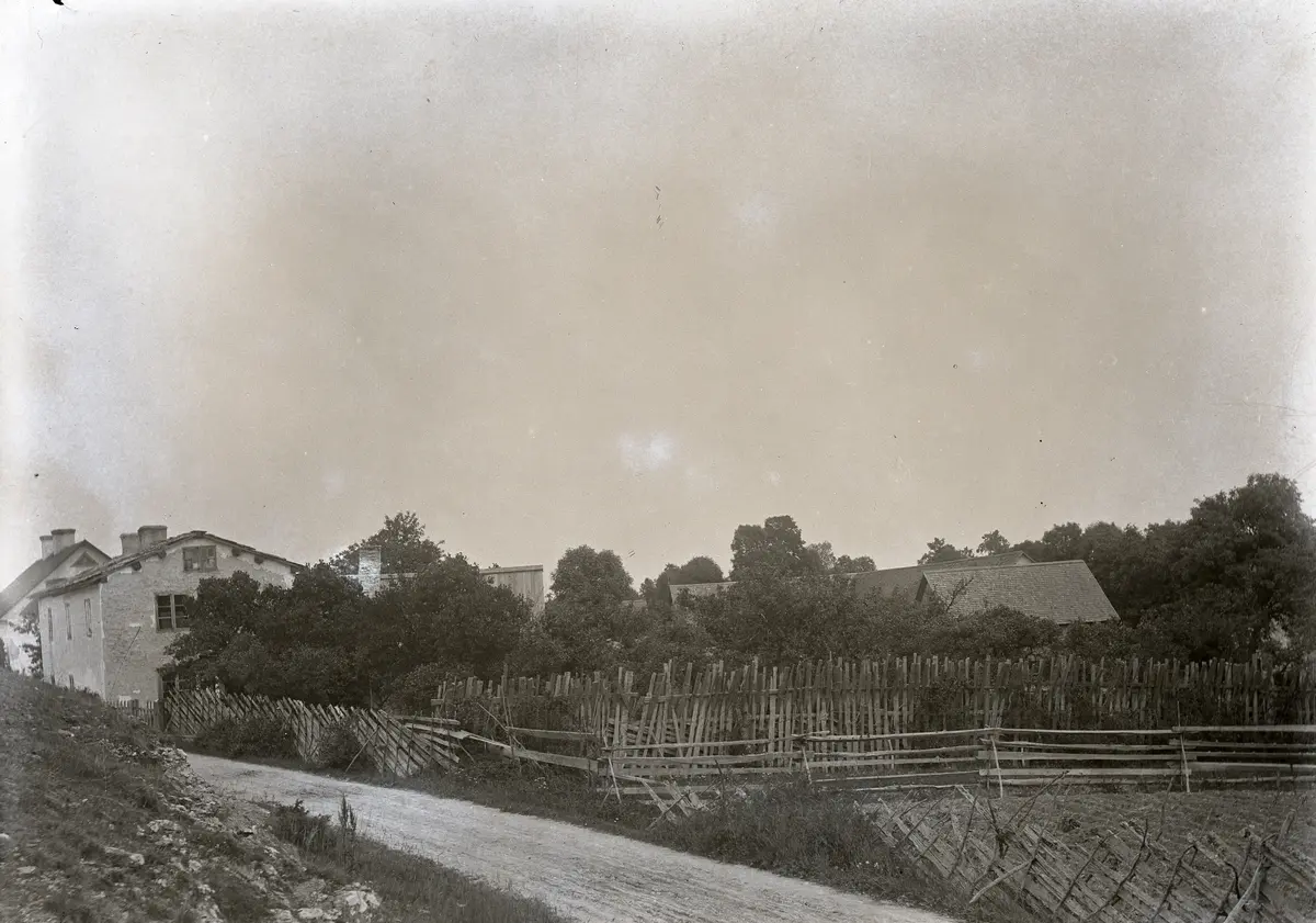 Masse har tagit bilden från backkanten med fokus på hägnaderna och med gårdsparternas ladugårdstak skymtande över trädgårdens fruktträd.