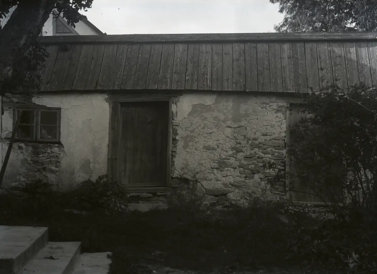 Här ser vi en närbild på den märkliga visthusboden/källaren som stod mellan manbyggnadens östra hörn och fönstret, se Bild 658. Om båda rummen haft källarfunktion är osäkert, källare brukar inte ha fönster. Saltskadorna på väggen intill högra dörren tyder på att källaren låg här. Förr slabbade man mycket med saltlaken i kött- och fisktunnorna och den sög väggarna i sig. Salt fräter på puts och sten, därav skadorna. Rummet med fönster måste ha haft en annan funktion. Snickarbod?? En ny större källare byggdes senare mot flygelns östra gavel med ingång från brygghuset.