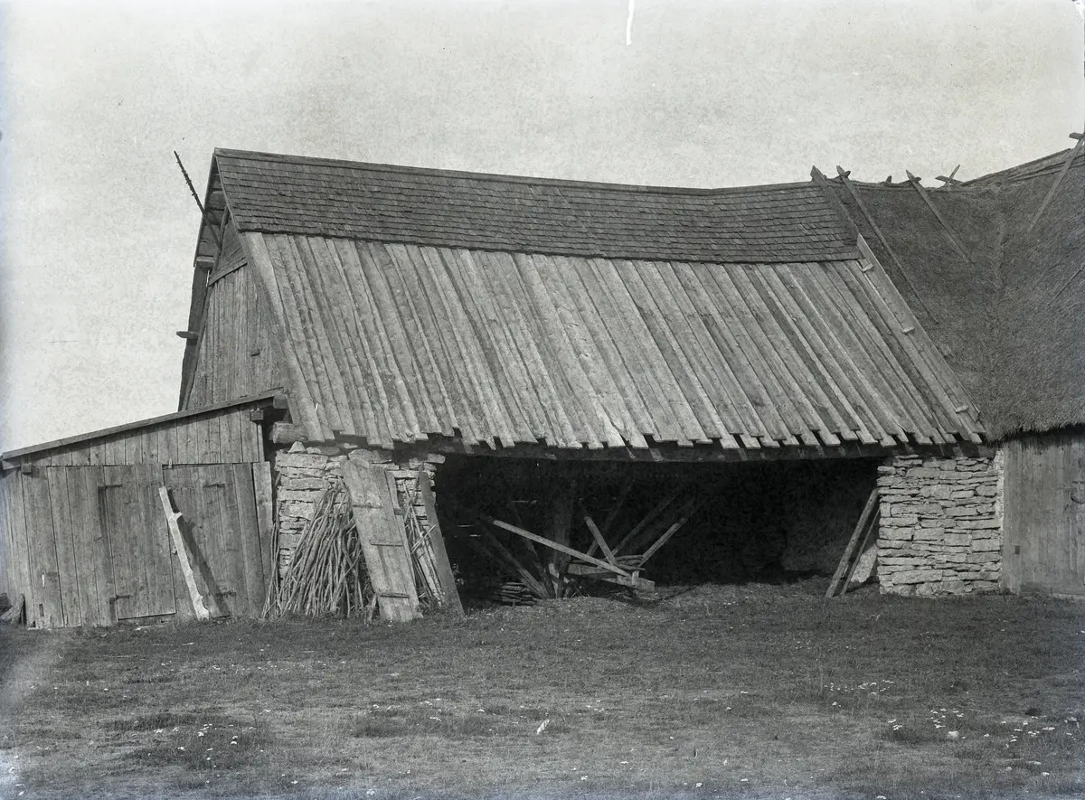 Här ses gårdens tröskhus med fal- och spåntak. Man kan se att faltaket är lagt med bredare underfalar och smalare överfalar. De är inte längdjusterade efter påläggningen, det brydde man sig ofta inte om på uthus, utan falarna fick ha den längd de fick vid apteringen i skogen, nästan alltid 7 alnar, dvs 4.20 m. De korta falarna upptill har blivit dåliga och då har man spikat på ett spånskikt över dem. Vandringshjulet finns ännu kvar. Skjulet på gaveln är nog inte så gammalt, trots att det lutar. Grenhopen mot tröskhuspelaren skyddas delvis av en avbruten kvarnvinge.