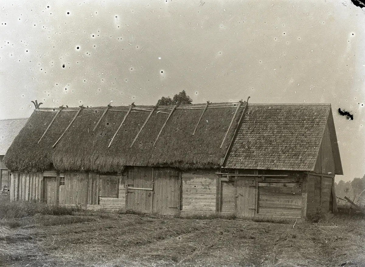Den lilla bulladugården kan nog vara byggd av Jakob Pettersson omkring 1860. Halmtaket har här börjat ersättas med spån. T v är det ett fähus med en hoimd t h med lucka, därefter lada, medan det är osäkert vad den högra tillbyggda buldelen varit nyttjad till. Längst t v skymtar bulladugården på Husarve mitt över vägen.